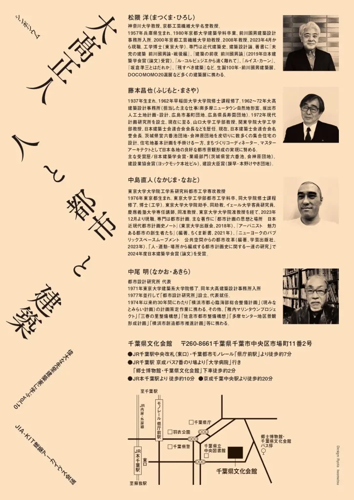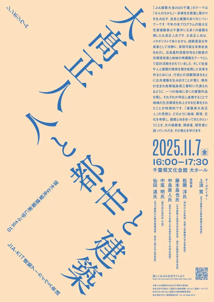 「JIA建築大会2025千葉」のテーマは「せんのちから」〜多様性を尊重し繋がりを生み出す、社会と建築のあり方について〜 です。今年の本プログラムで取り上げる偉大な先輩建築家は、千葉市にも多くの建築を残した大高正人氏です。